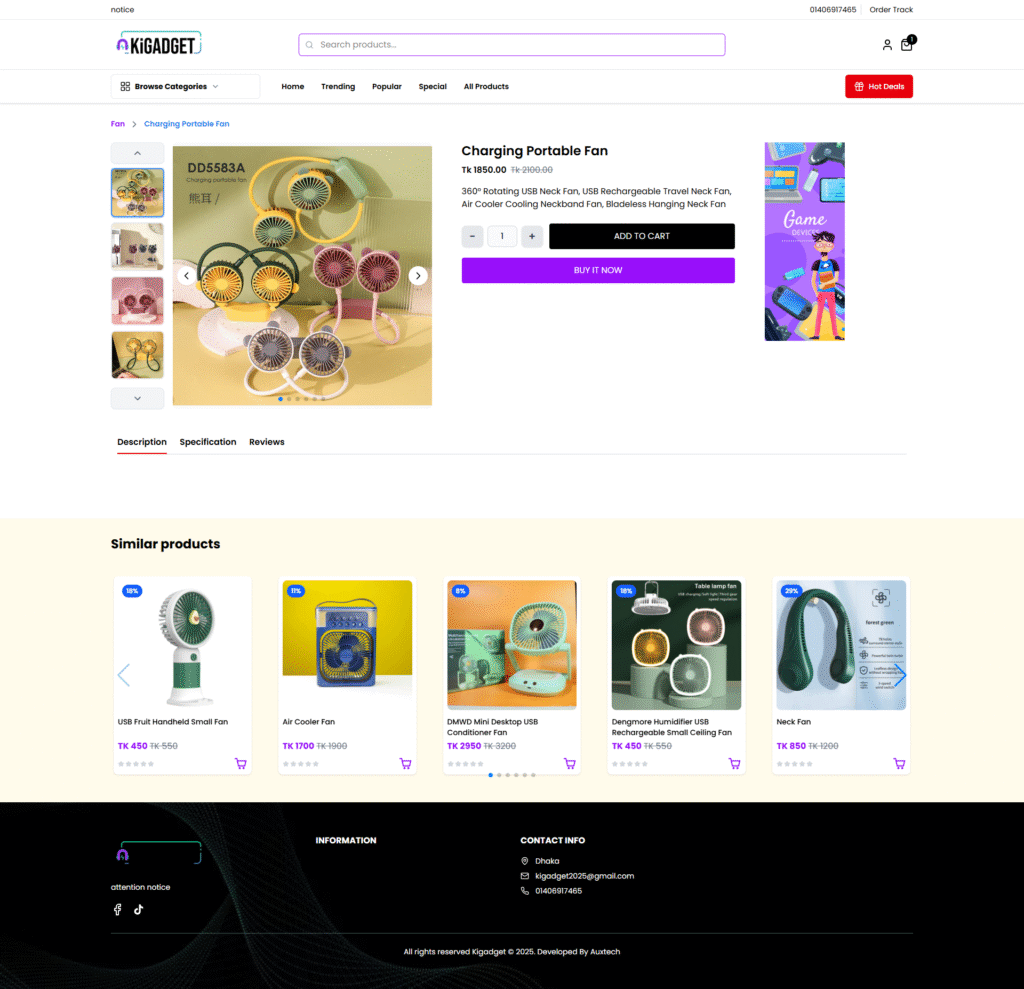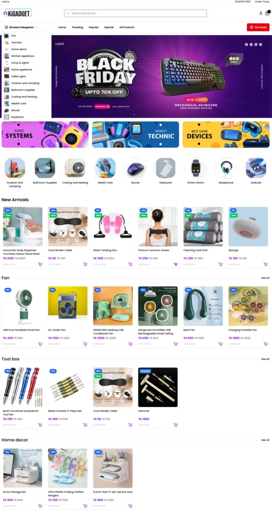 KiGadget Ecommerce is a modern, high-performance web application designed with scalability, responsiveness, and performance in mind. It is built using the Vue.js JavaScript framework and enhanced by Nuxt.js, an intuitive open-source Vue framework that supports server-side rendering (SSR) and static site generation (SSG) for lightning-fast load times and SEO optimization.